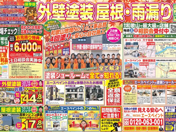 9月チラシキャンペーン 開催中です!お問い合わせはお早めに 累計口コミ数 120件超えの外壁塗装・屋根塗装・雨漏り専門店【外壁塗装 屋根塗装 和歌山市 エースペイント】 ✨